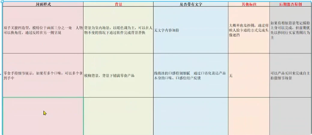 拆解优质对标内容,主要是帮助我们明确优质笔记的封面样式、背景风格、内容标注、文字排版等细节,拆解表格如下图: